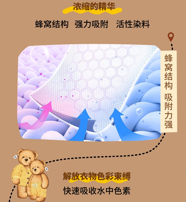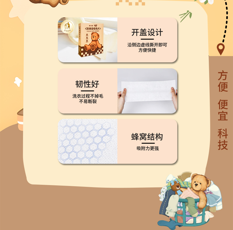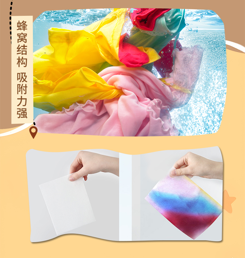 吸附量大:涤小萌吸收片采用80g加厚布料,可以吸附大量的色素,能够满足不同衣物数量和不同褪色程度的洗衣需求。