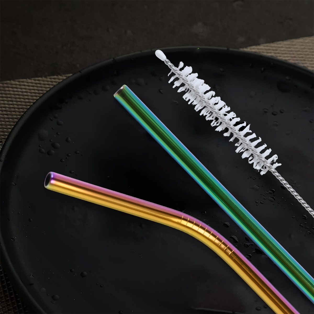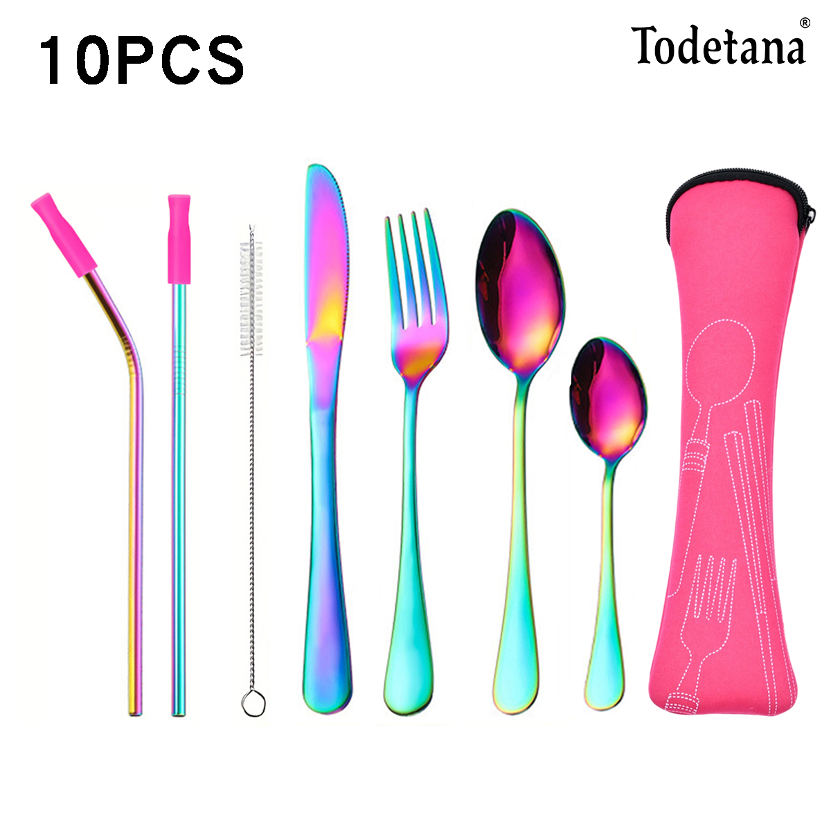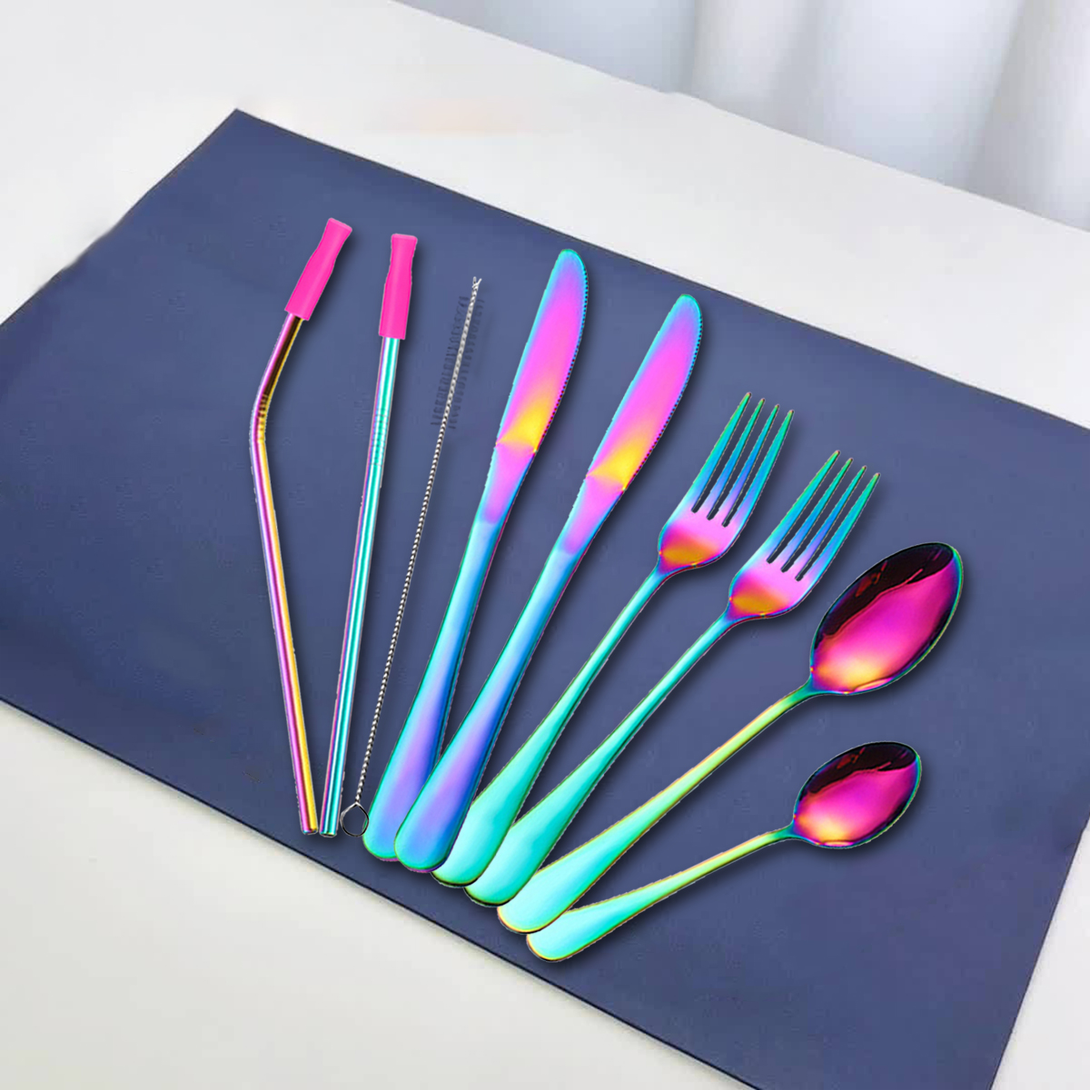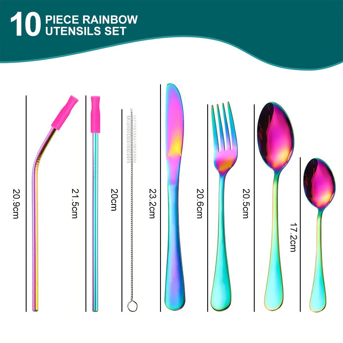 这款 10 件套幻彩餐具,色彩绚丽夺目,如梦幻光谱般迷人。包含刀、叉、勺,满足用餐基本需求,还有吸管及配套刷,增添多样使用场景。均采用优质不锈钢材质,食品级安全标准,耐腐蚀、耐磨且经久耐用。手柄符合人体工学,握感舒适。吸管配防尘盖,清洁刷方便清理。无论是日常用餐、户外野餐还是派对聚会,都是兼具实用与颜值的绝佳选择。