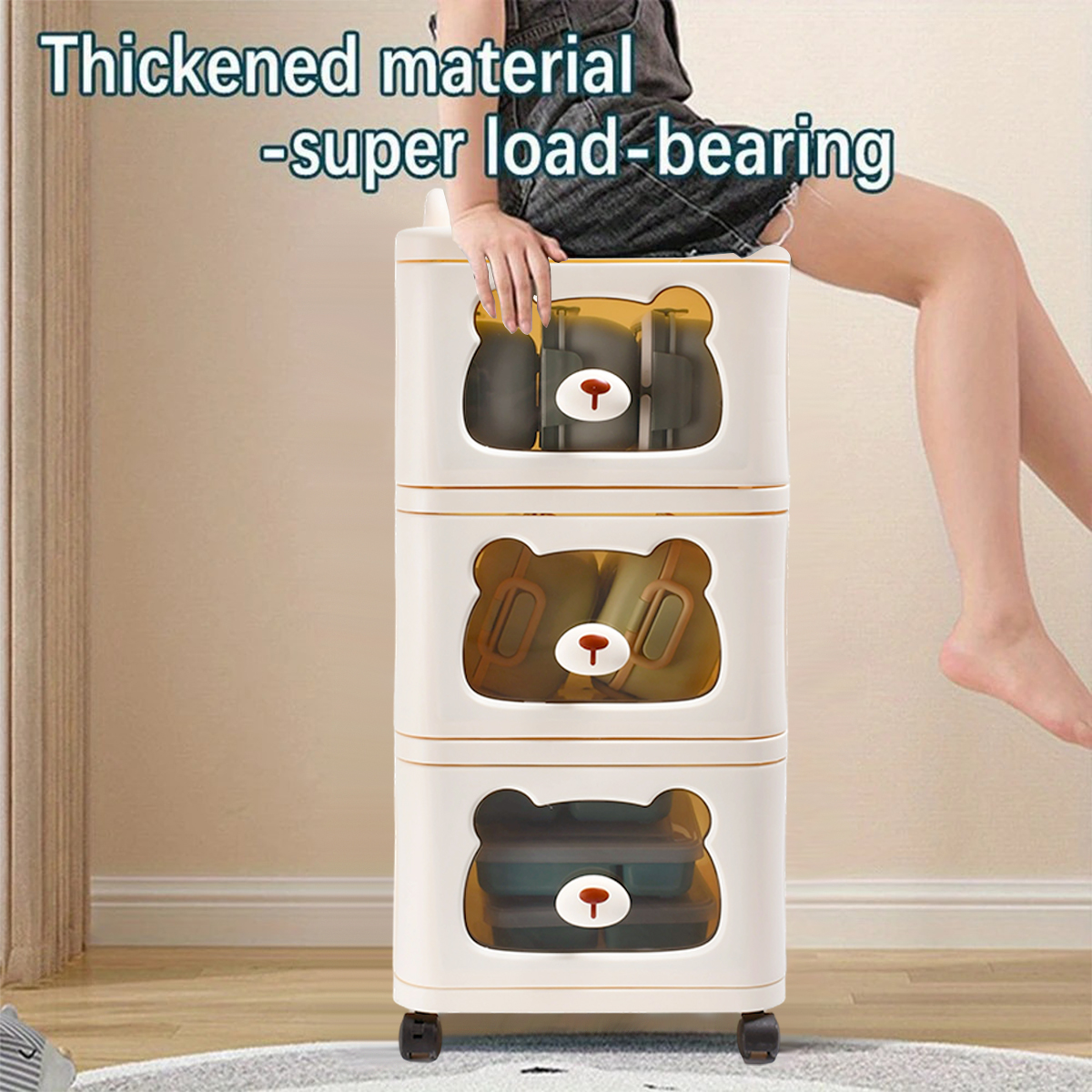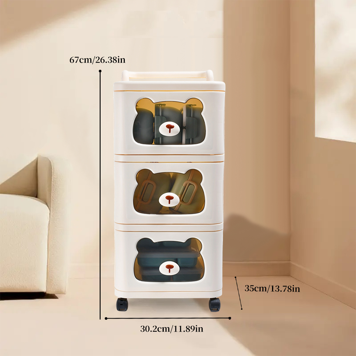 多层收纳,3层收纳,小熊图案,承重力强,抽屉顺滑,防水防潮,防尘设计,拆装方便,稳固结构,加厚材质,静音滑轨,耐磨抗压,节省空间,提高收纳效率,分类整理好帮手,移动设计(带滑轮),多用途组合,组装便捷,家庭必备